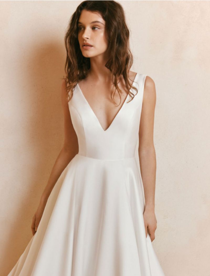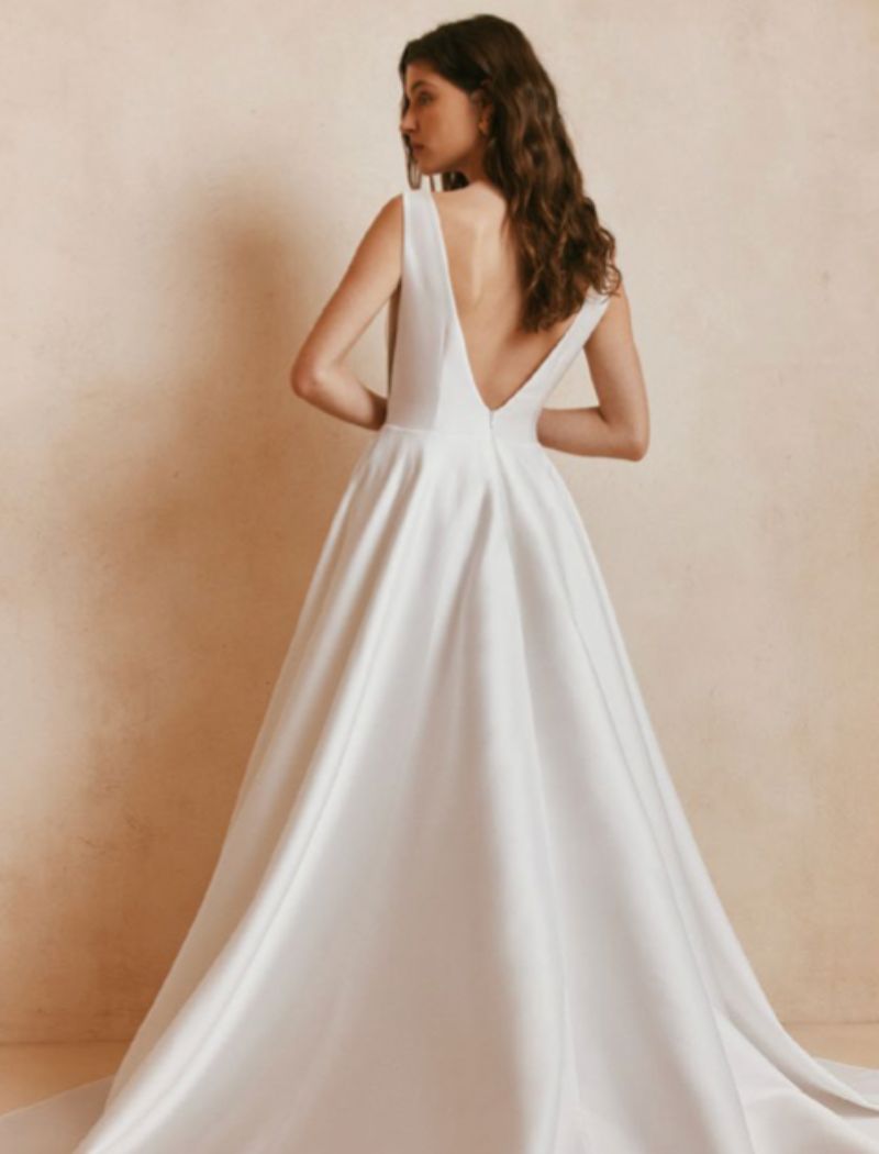 Robe trapèze en mikado. Les fleurs 3D sont en option.