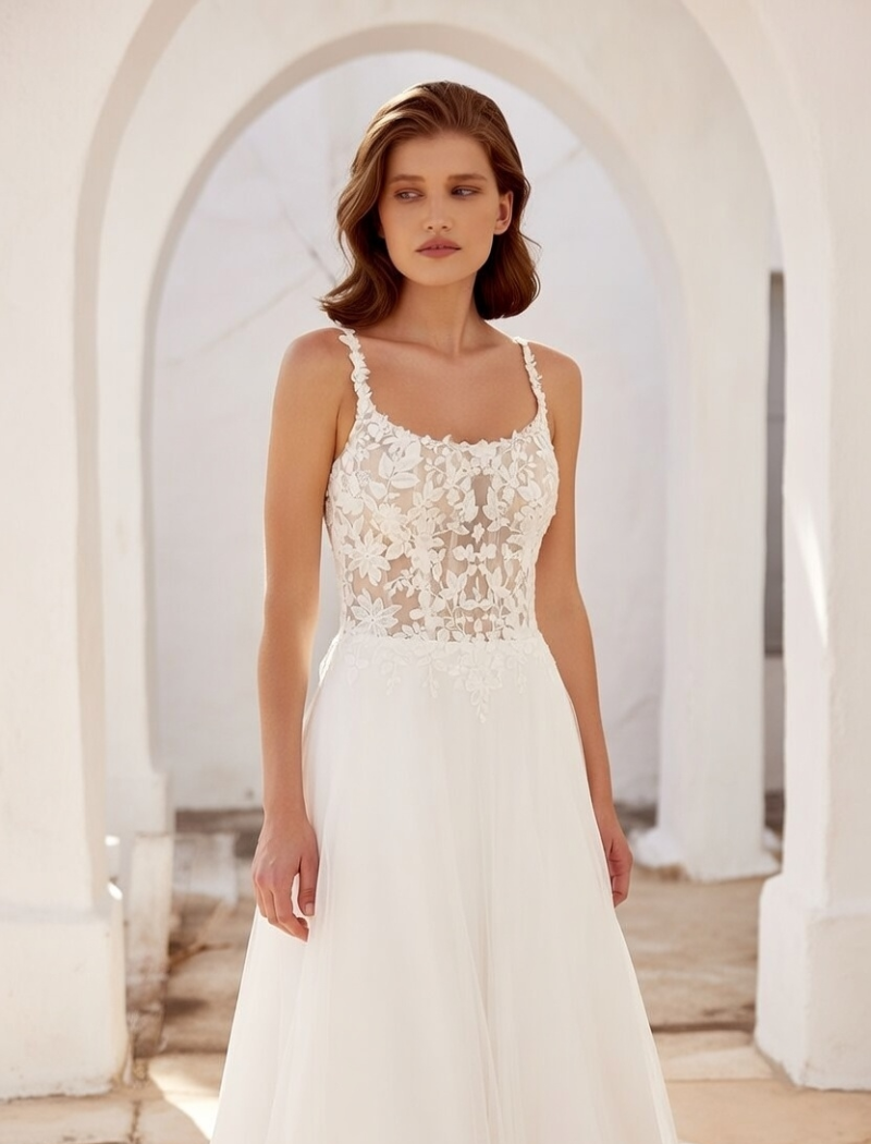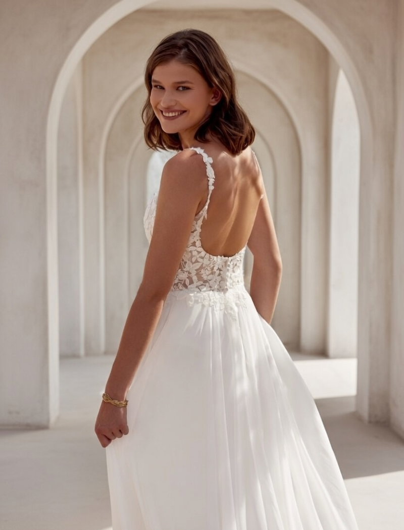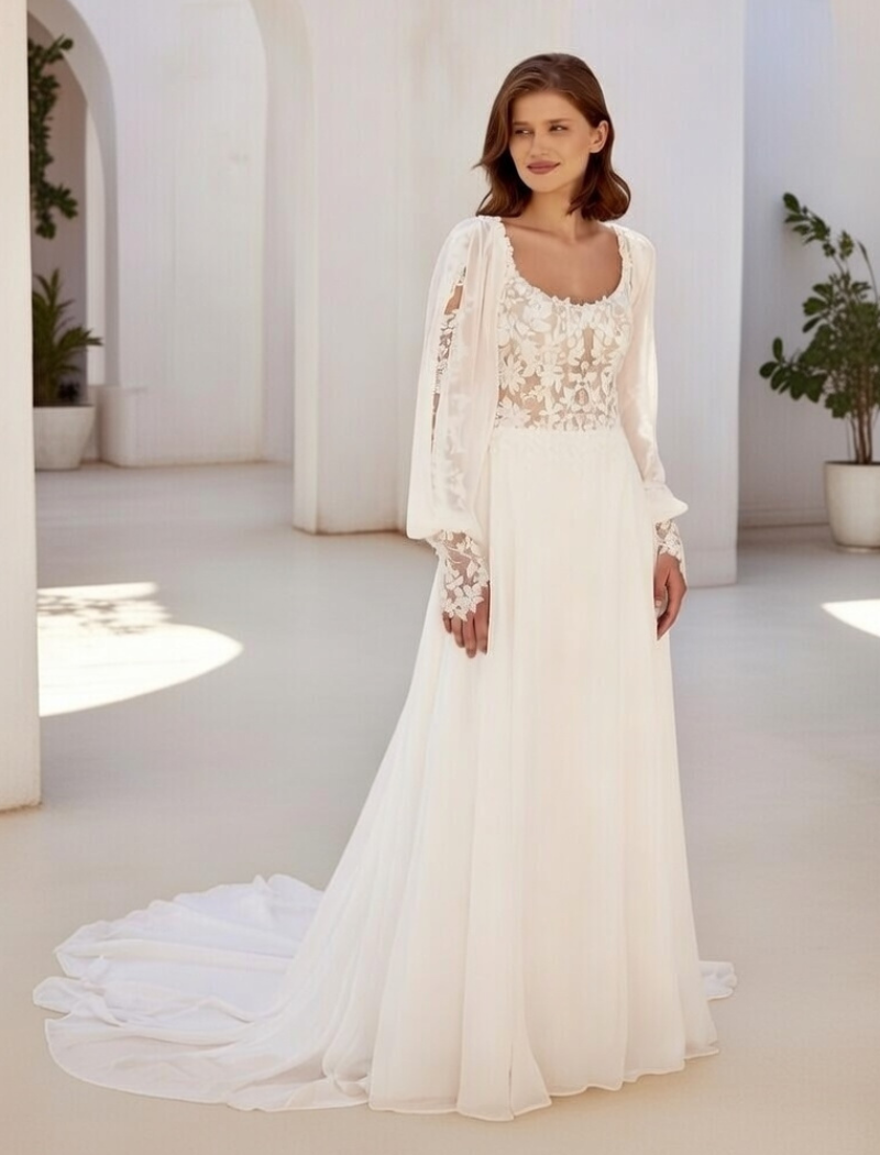 Robe fluide avec décolleté rond se transforme grâce à des manches amovibles bouffantes en dentelle et mousseline.