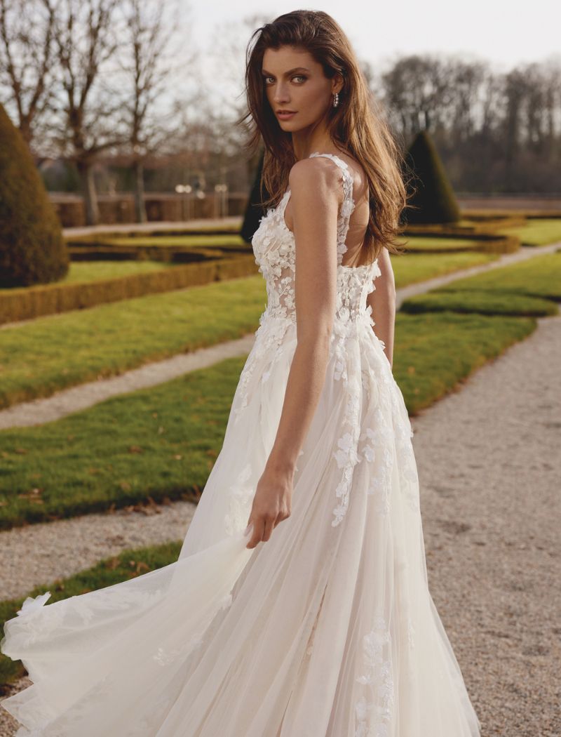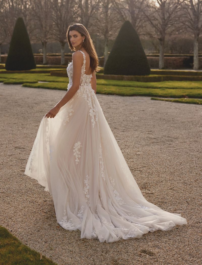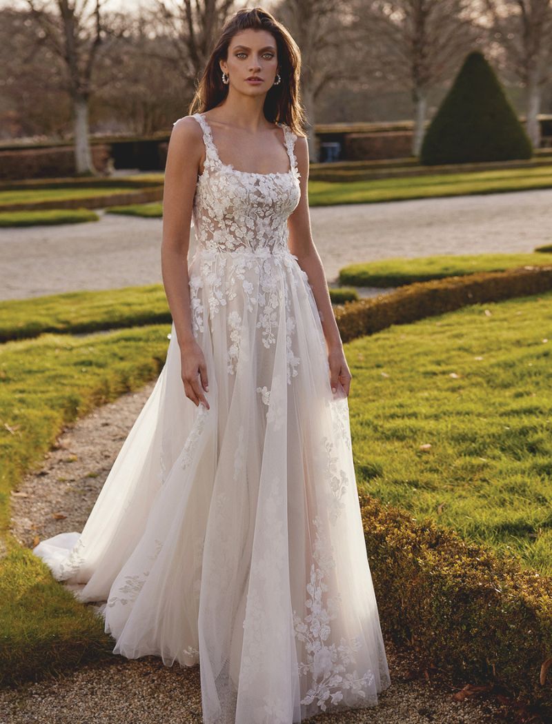 Robe trapèze en tulle avec encolure carrée et appliques florales en 3D.