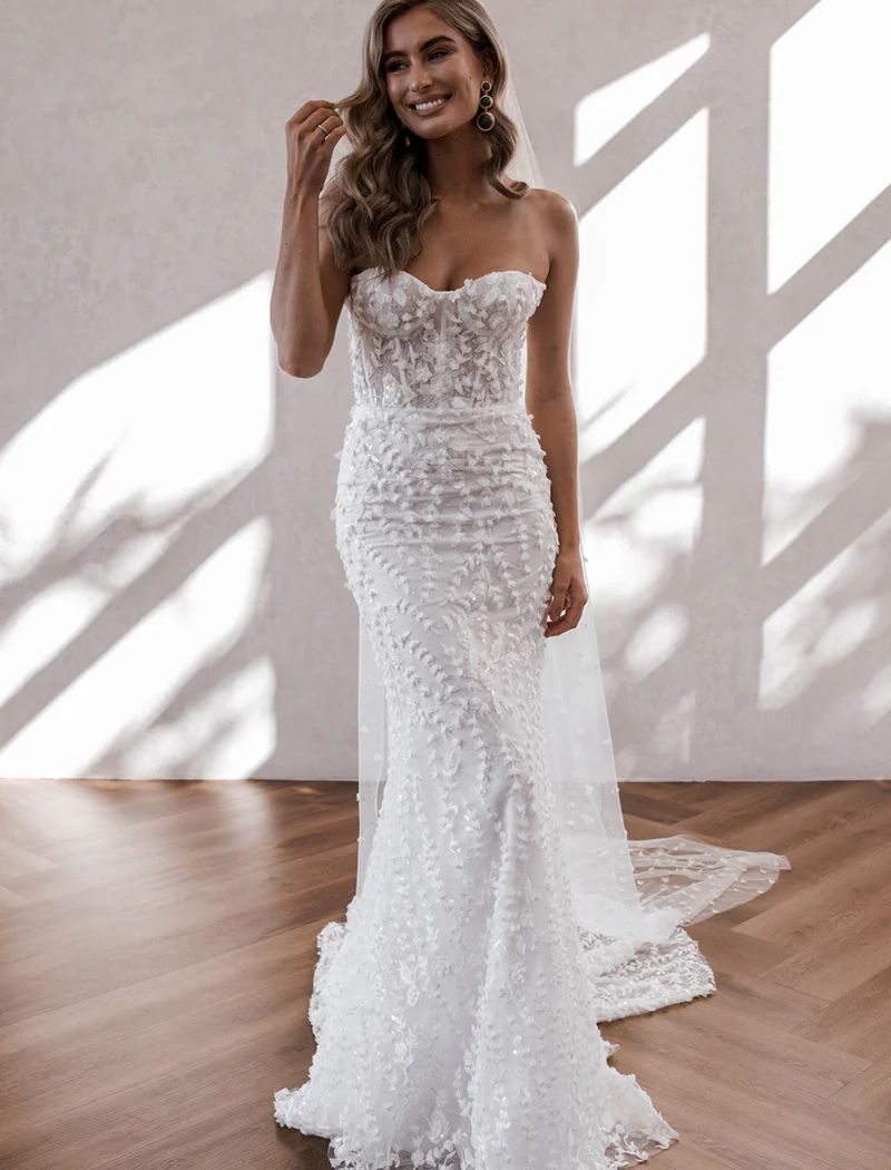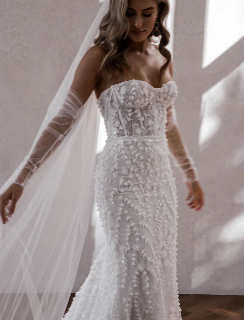Posie est confectionnée d’une magnifique dentelle florale 3D texturée et pailletée. Son corsage présente une coupe bustier. Sa coupe près du corps est conçue pour sublimer toutes les silhouettes.