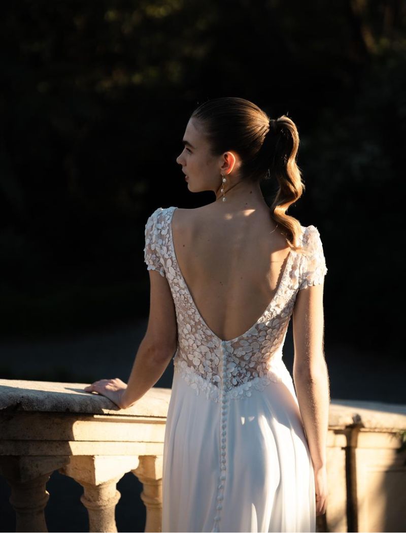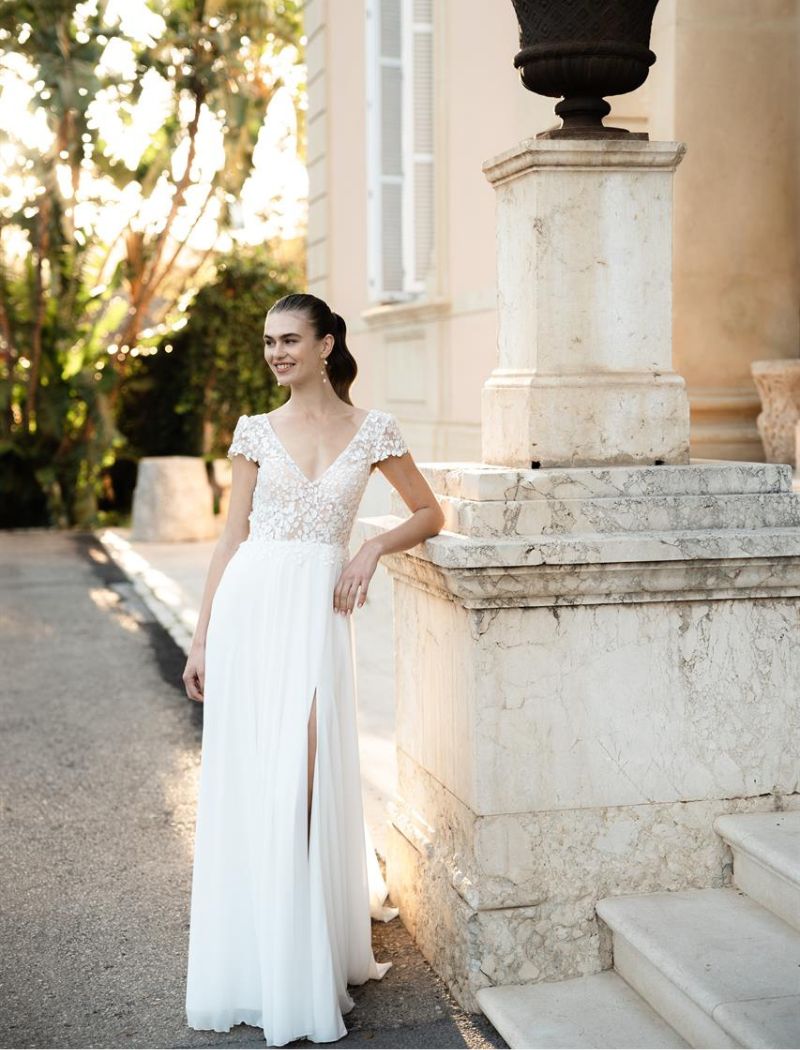 Kiss From A Rose présente un décolleté en V devant et derrière. Le haut et les manches courtes sont ornés de broderies. La jupe en mousseline douce est fendue sur le devant.