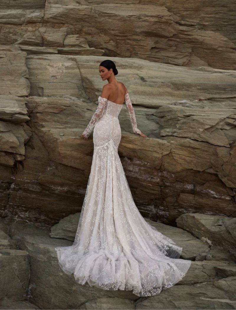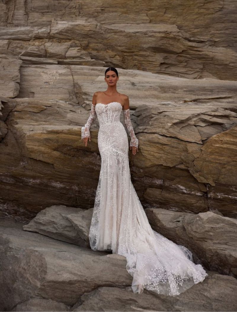 Ismeria est une magnifique robe sirène en dentelle, délicatement ornée d’appliques florales scintillantes. Dotée d’un décolleté en cœur avec un corsage structuré et de manches épaules dénudées amovibles.