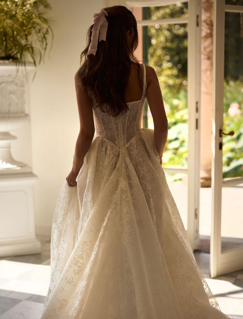 Cette robe à la silhouette princesse majestueuse, est confectionnée en délicate dentelle. Elle présente un corset et un décolleté carré maintenu par de fines bretelles.