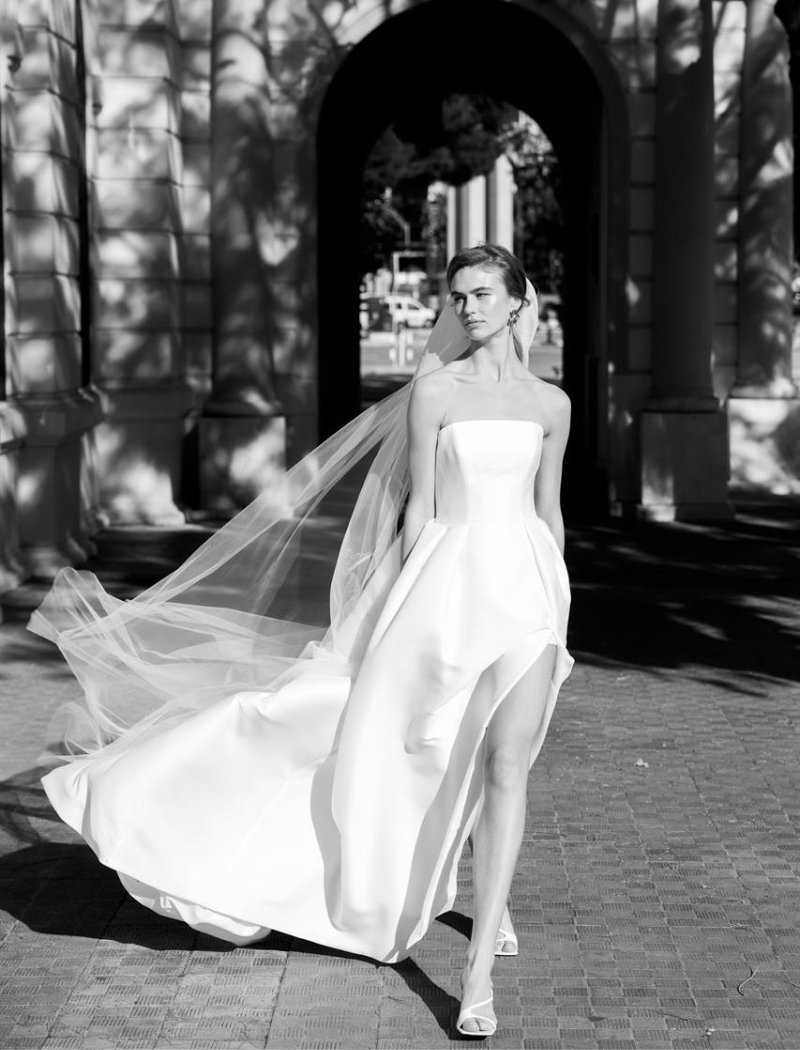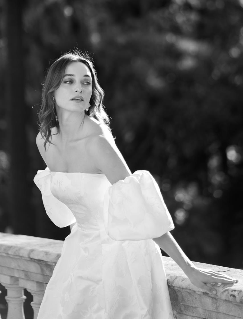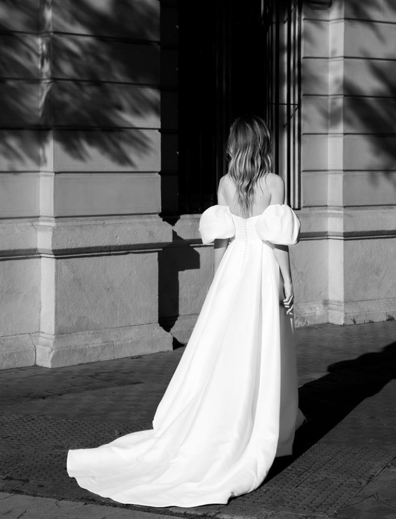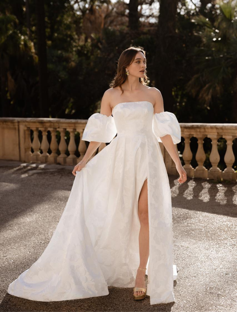 Robe bustier de forme A avec poches, en mikado structuré. La jupe a des plis à la taille pour donner plus de volume, une fente sur le devant et une traîne chapelle. Elle est accompagnée de manches ballon détachables assorties.