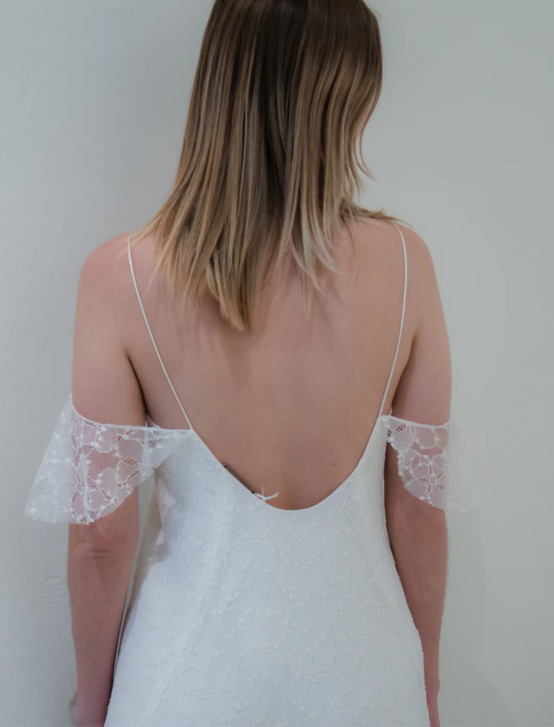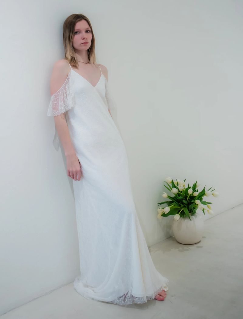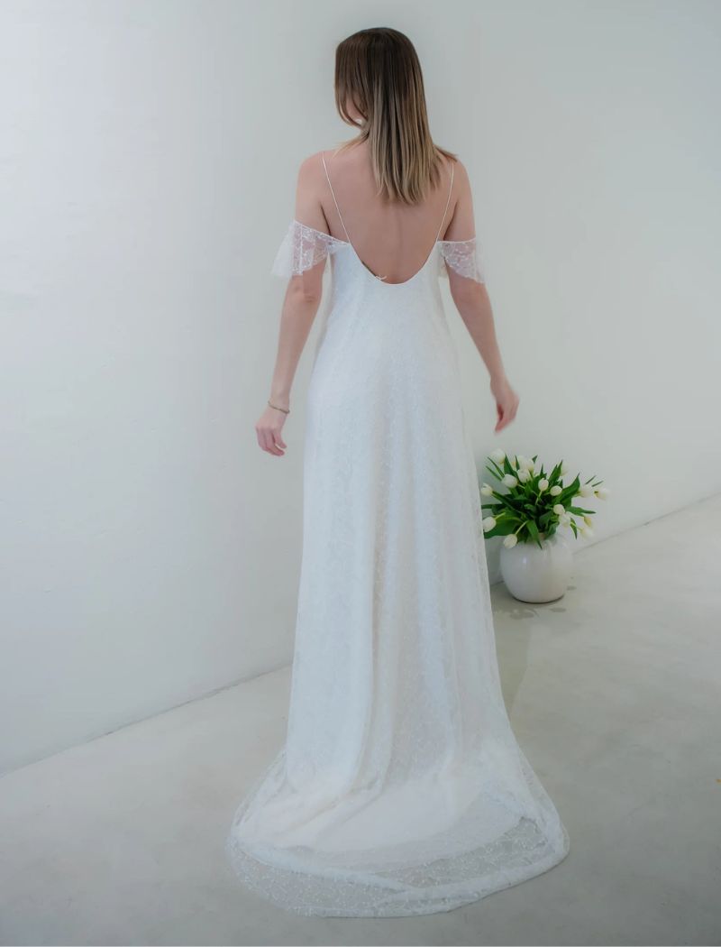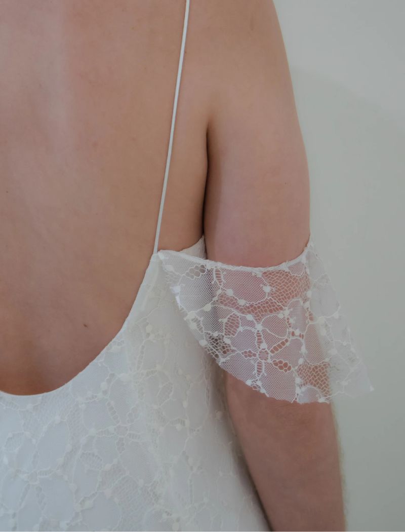 Robe avec des manches délicates en tulle brodé qui apportent un air romantique.