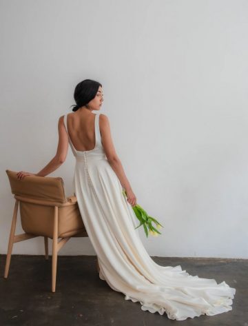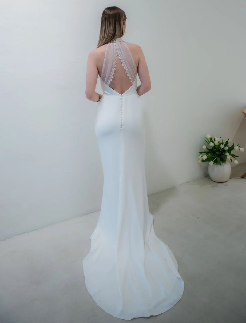La robe Cuarzo est une robe à col américain avec un joli dos travaillé en tulle.