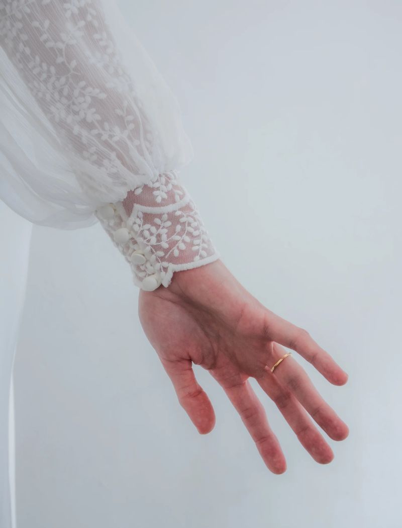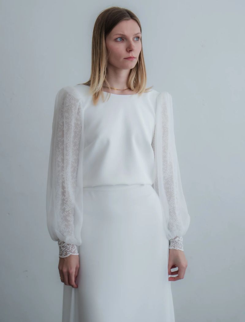 Le top Zircon est un top avec des manches en dentelles doublées en mousseline.