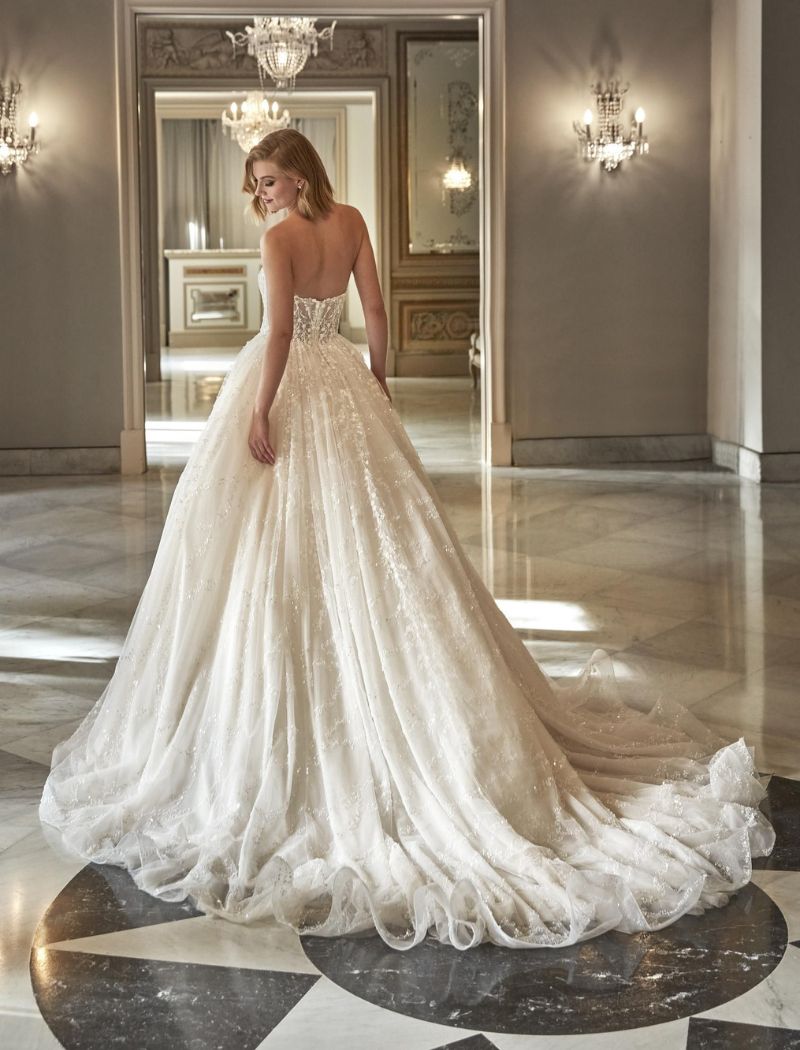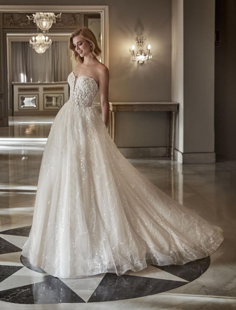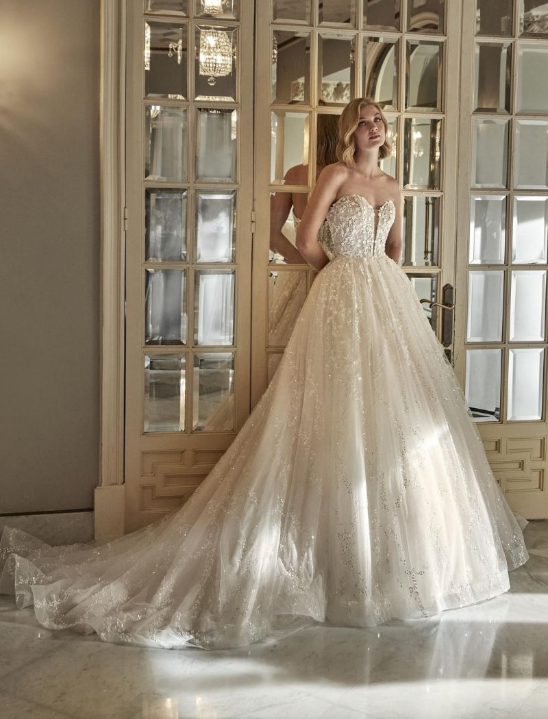 Alisette est un robe princesse avec un décolleté en cœur, en tulle perlé et sequins pour une apparence lumineuse et romantique.