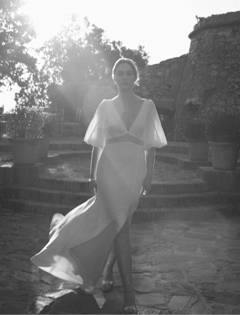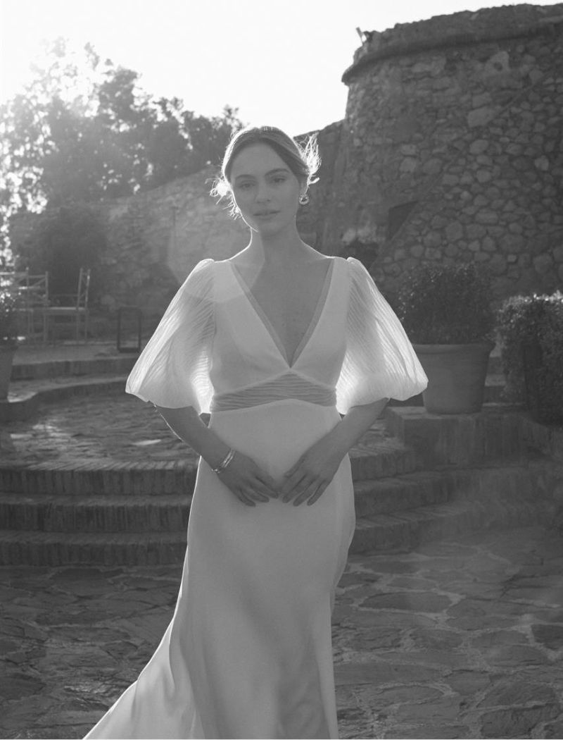 Poderosa incarne un style minimaliste et une grâce naturelle. Cette robe en crêpe présente un décolleté en V. Les manches bouffantes jusqu’aux coudes sont en tulle plissé, tout comme la ceinture. La jupe est fendue sur le devant.