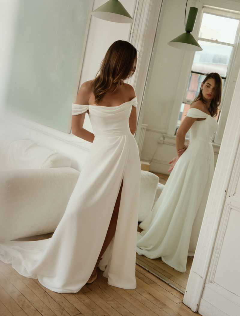 Robe à épaules dénudées en crêpe stretch mat, avec corsage bas structuré et encolure arrondie. Détails drapés sur le buste formant des manches plissées. Dos dégagé avec boutons recouverts jusqu’à la traîne cathédrale. Jupe ample avec fente latérale.
