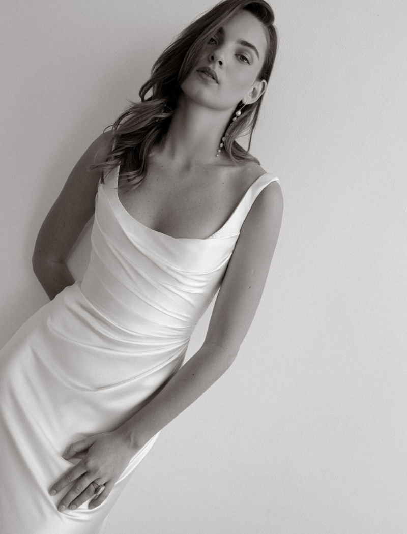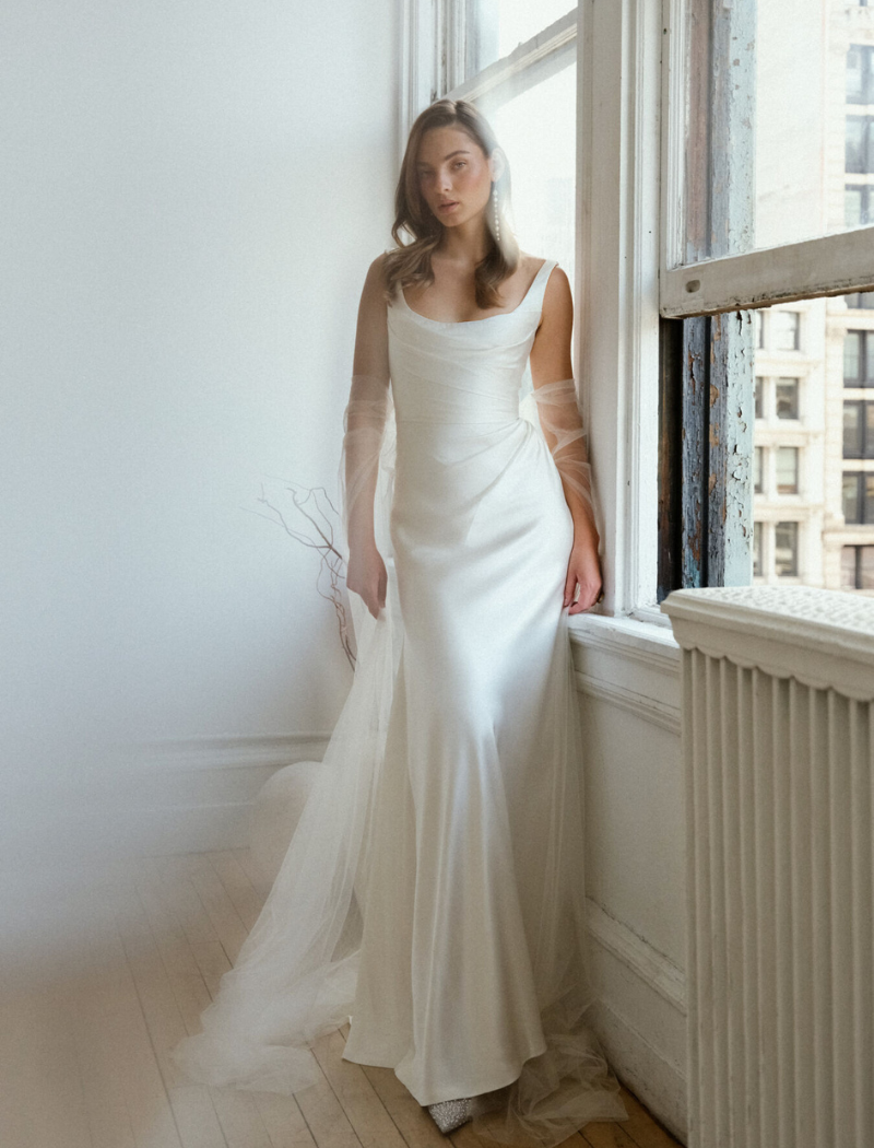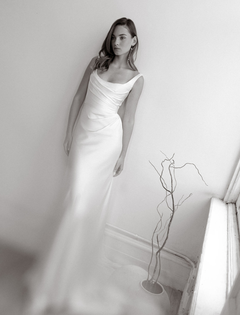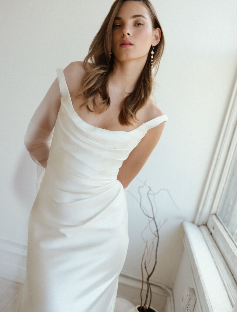 La robe Zara se caractérise par un corsage très structuré, esprit corset, en satin italien, rehaussé de fronces flatteuses qui sculptent délicatement le buste et les hanches.